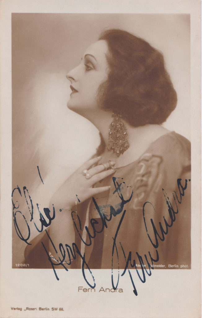 In Berlin traf Fern Andra auf Max Reinhardt, bei dem sie Schauspielunterricht nahm. 1913 spielte sie in ihrem ersten deutschen Film mit dem Titel „Das Ave Maria“. Noch mäßig bekannt, spielte sie 1915 auch das einzige Mal in einem österreichischen Film mit („Zwei Freunde“). Den Geschmack des zeitgenössischen Publikums treffend, trat sie vor allem in sentimentalen Unterhaltungsfilmen auf, beeindruckte aber auch durch artistische Leistungen in Zirkusfilmen. Zwischen 1916 und 1918 stand sie fast ausschließlich mit Alfred Abel vor der Kamera, 1920 spielte sie in Robert Wienes „Genuine“. Den Großteil ihrer Filme zwischen 1915 und 1925 produzierte sie, gemeinsam mit ihrem (seit 1917) Kompagnon Georg Bluen, mit der eigenen Firma Andra-Film bzw. Fern Andra-Film Co. Georg Bluen. Mitte der 1920er Jahre schwand ihre Beliebtheit beim deutschen Publikum, so dass sie ab 1928 in Großbritannien und den USA, später dort auch beim Rundfunk und im Fernsehen arbeitete. Ihre letzte Filmrolle spielte sie 1930 in „Lotus Lady“.