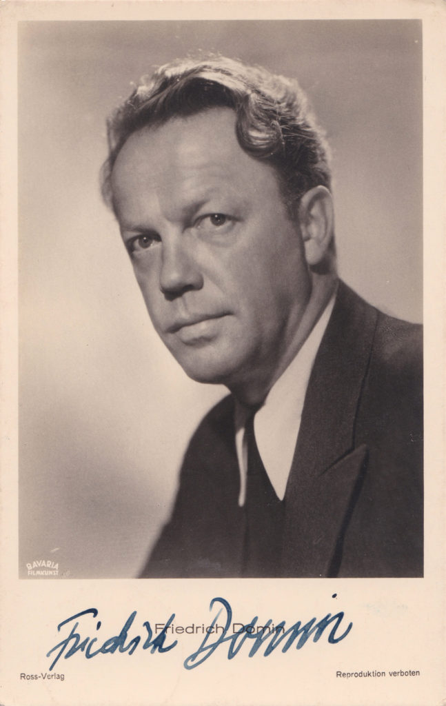 Seit 1939 übernahm Friedrich Domin auch Filmrollen. Er war auf Ehrfurcht gebietende Honoratioren abonniert, z.B. als Gefängnisdirektor in „Der Hauptmann von Köpenick“, General in „Ein Mädchen aus Flandern“, Zirkusdirektor in „Lola Montez“, Kommerzienrat in „Rosenmontag“, Bankier in „Die Trapp-Familie“, Graf Egge in „Schloß Hubertus“, Reichskanzler Bismarck in „Ludwig II. – Glanz und Elend eines Königs“, Hindenburg in „Sauerbruch – Das war mein Leben“, oder als Bischof in dem Pater-Brown-Krimi „Das schwarze Schaf“.