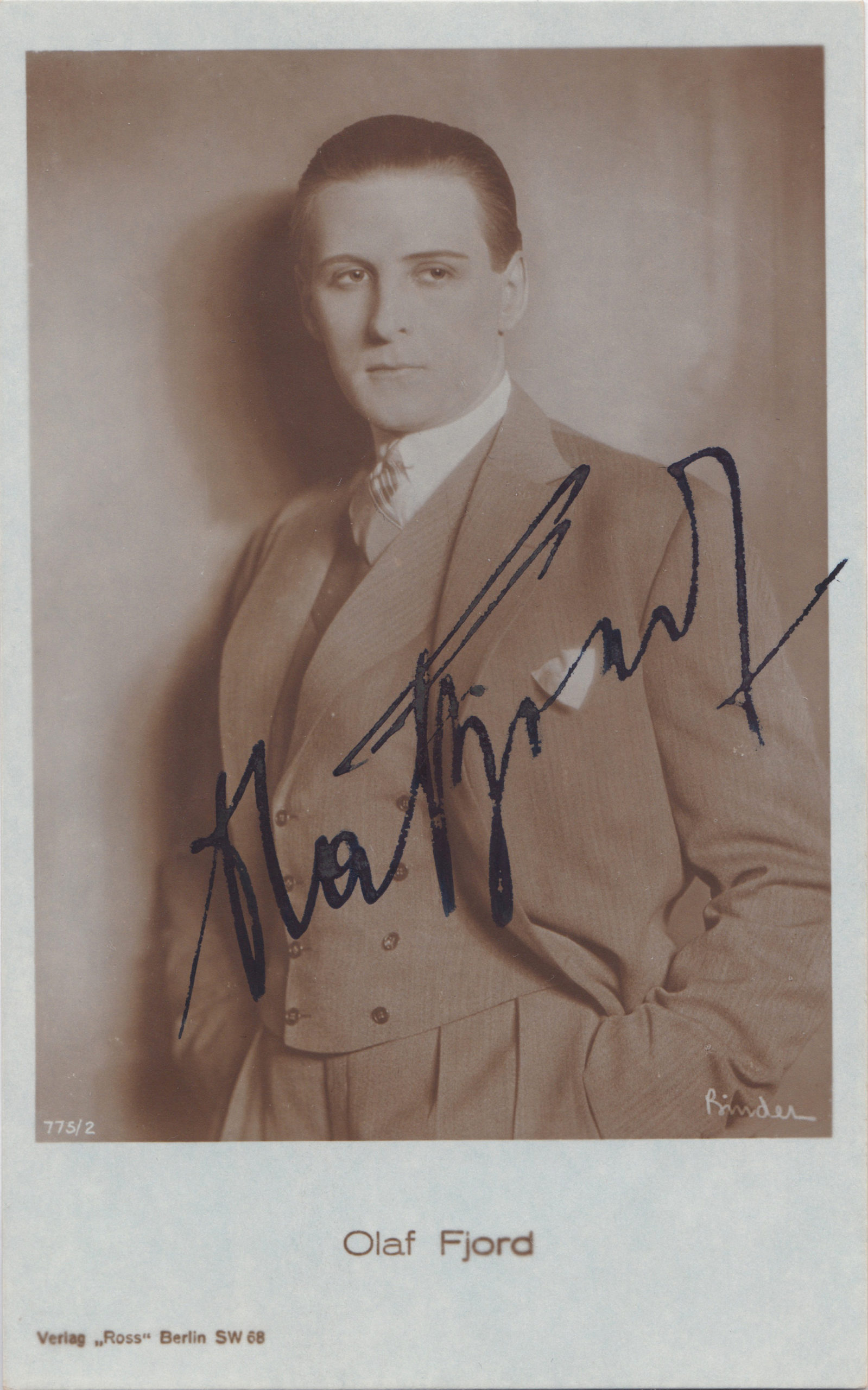 Er nahm den Künstlernamen Olaf Fjord an und war als Schauspieler in zahlreichen österreichischen, französischen, tschechischen und amerikanischen Stumm- und Tonfilmproduktionen zu sehen. Unter anderem verkörperte er 1921 in der Biografie „Ludwig II.“ den Bayernkönig Ludwig II. In seiner Vita bezeichnete er sich wiederholt als Norweger.