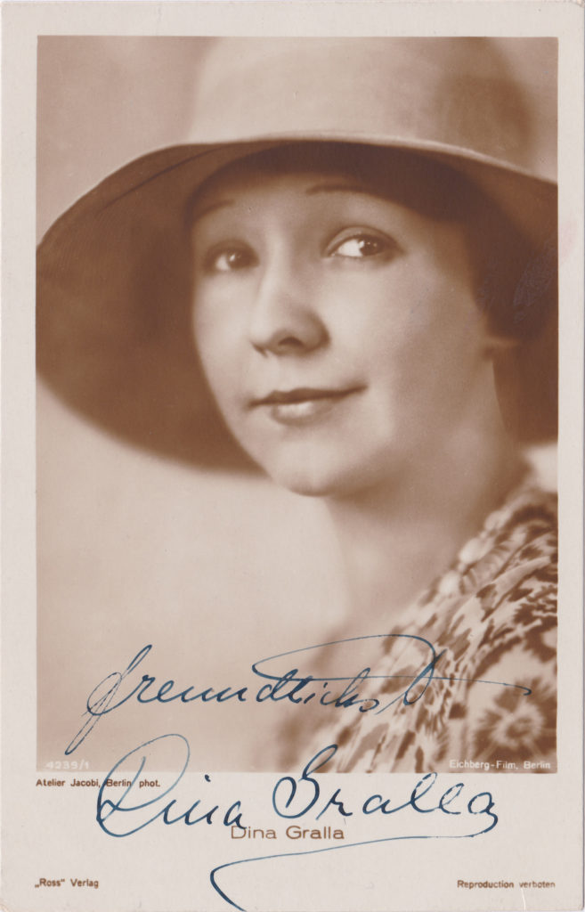 Danach war Dina Gralla häufig im deutschen Stummfilm als naiv-erotisches Mädchen zu sehen, anfangs mehrmals zusammen mit Lilian Harvey. Wiederholt verkörperte sie Tänzerinnen, insbesondere 1928 als Hauptdarstellerin in dem erfolgreichen Revuefilm Das Girl von der Revue. Sie agierte zu dieser Zeit auch auf der Bühne als Schauspielerin, zum Beispiel im Theater in der Behrenstraße.
