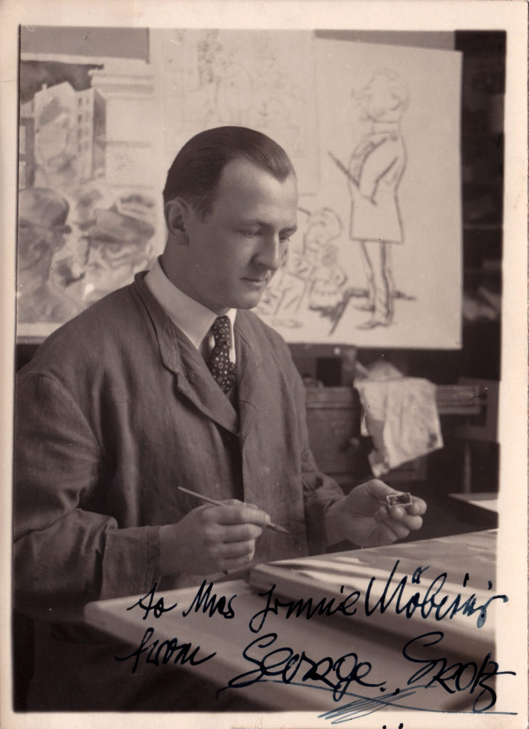 George Grosz (* 26. Juli 1893 als Georg Ehrenfried Groß in Berlin; † 6. Juli 1959 ebenda) war ein deutsch-amerikanischer Maler, Grafiker, Karikaturist und Kriegsgegner. George Grosz‘ sozial- und gesellschaftskritische Gemälde und Zeichnungen des Verismus, die überwiegend in den 1920er-Jahren entstanden sind, werden der Neuen Sachlichkeit zugerechnet. Diese Arbeiten zeichnen sich durch zum Teil drastische und provokative Darstellungen und häufig durch politische Aussagen aus. Sein Werk trägt aber auch expressionistische, dadaistische und futuristische Züge. Typische Sujets sind die Großstadt, ihre Abseitigkeiten (Mord, Perversion, Gewalt) sowie die Klassengegensätze, die sich in ihr zeigen. In seinen Werken, oft Karikaturen, verspottet er die herrschenden Kreise der Weimarer Republik, greift soziale Gegensätze auf und kritisiert insbesondere Wirtschaft, Politik, Militär und Klerus.
