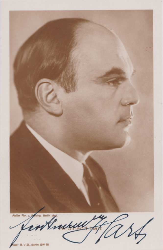 Seit Ende der Stummfilmzeit trat Ferdinand Hart mit zahlreichen Nebenrollen vor die Kamera. Von den Nationalsozialisten als sog. ‘Volljude’ geächtet, erhielt Hart nach deren Machtergreifung 1933 sofort Auftrittsverbot. Seine letzte Theaterrolle spielte Ferdinand Hart im Februar 1933 am Deutschen Theater mit dem König Thoas in Goethes ‘Iphigenie auf Tauris‘. Hart kehrte noch im Frühling desselben Jahres in die Tschechoslowakei zurück. Dort setzte er seine Bühnen- und Filmarbeit fort. In Julien Duviviers Neuverfilmung der alten, jüdischen Golem-Legende spielte er 1935/36 die aus Lehm gestaltete Titelfigur. Sein Filmpartner war der bedeutende französische Charakterstar Harry Baur. Hart starb infolge einer Herzthrombose, die er sich im Dezember 1936 zugezogen hatte.