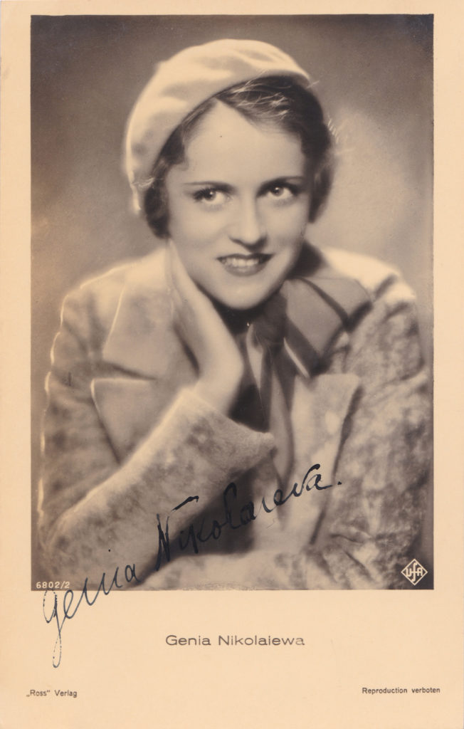 1930 debütierte sie als Schauspielerin in der Revue „Alles Schwindel“, danach folgten Rollen in mehreren Revuen und Operetten. Gleichzeitig wurde der Film auf sie aufmerksam und gab Genia Nikolajewa mehrfach Tanzauftritte oder kleinere, manchmal, wie in dem Kriminalfilm „Schuß im Morgengrauen“, auch größere Nebenrollen.