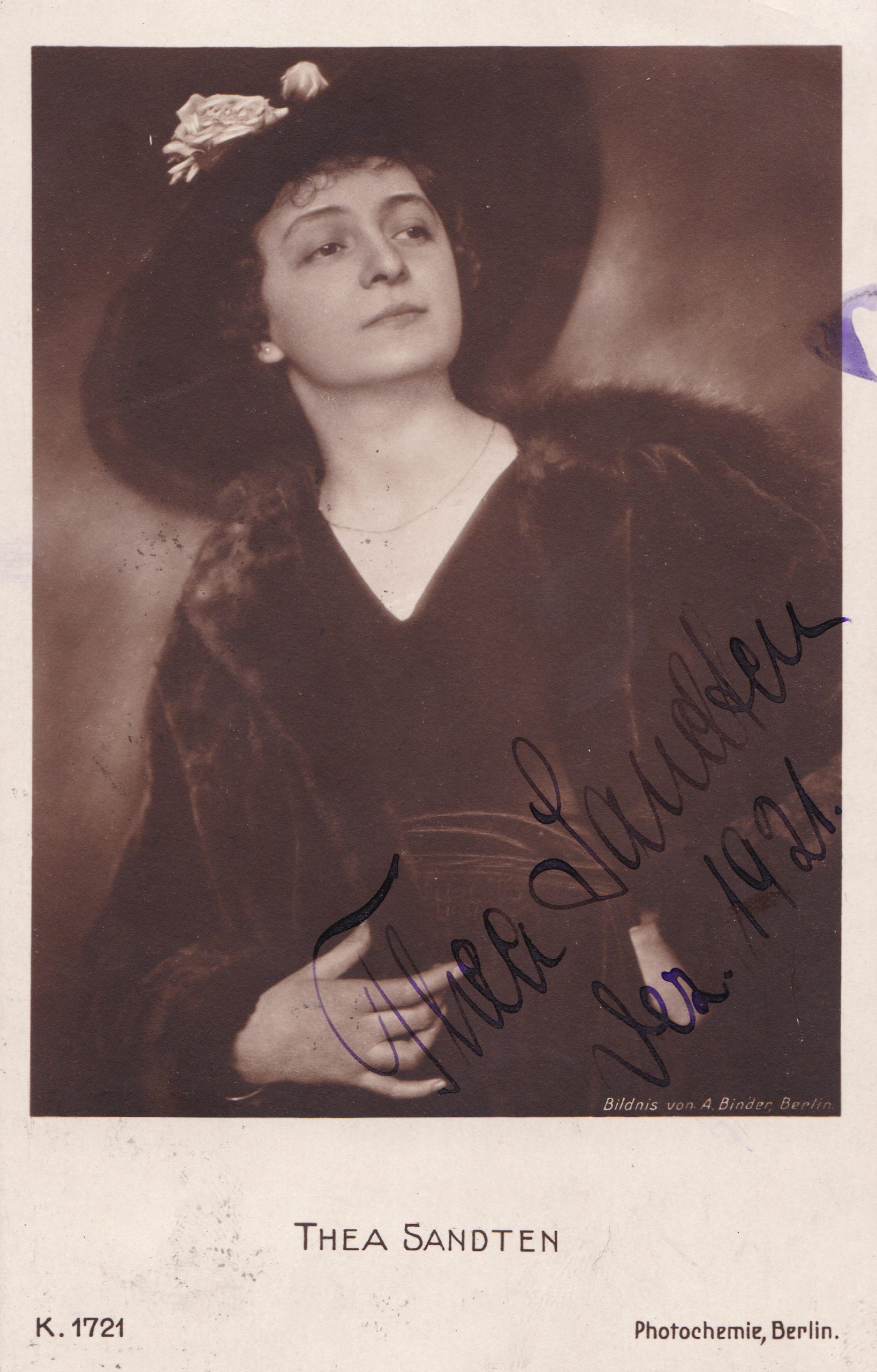 Tragende Rollen spielte Thea Sandten, die ihre gesamte Karriere hindurch fast ausschließlich in ‚Frauenfilmen‘ auftrat und 1913 für vier Produktionen auch nach Italien verpflichtet wurde, in den unterschiedlichsten dramatischen Geschichten. Oft hatte sie ein schweres Schicksal zu meistern oder wurde aus einer großen Gefahr gerettet. Thea Sandten wirkte in ihrer nur zehn Jahre währenden Leinwandkarriere an der Seite berühmter Stummfilmkollegen wie Asta Nielsen, Hanni Weisse und Alexander Moissi.