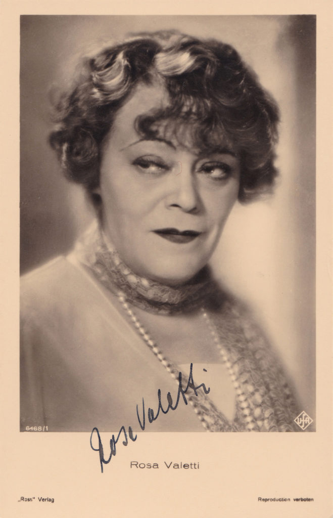 Ab 1911 erhielt Rosa Valetti auch Filmrollen. Die eher resolut wirkende Schauspielerin war meistens in Mutterrollen zu sehen, in dem Film „Die Prinzessin und der Geiger“ spielte die 46-jährige bereits eine Großmutter. In der berühmten Produktion „Der blaue Engel“ ist sie in der Rolle der Guste, der Ehefrau des Direktors und Zauberkünstlers (gespielt von Kurt Gerron), zu sehen. Neben Josef von Sternberg drehte sie auch mit anderen bekannten Filmregisseuren, sie spielte etwa die böse Haushälterin in Friedrich Wilhelm Murnaus „Tartüff“ und war in Fritz Langs Filmklassiker „M“ in einem Kurzauftritt als Wirtin zu sehen.
