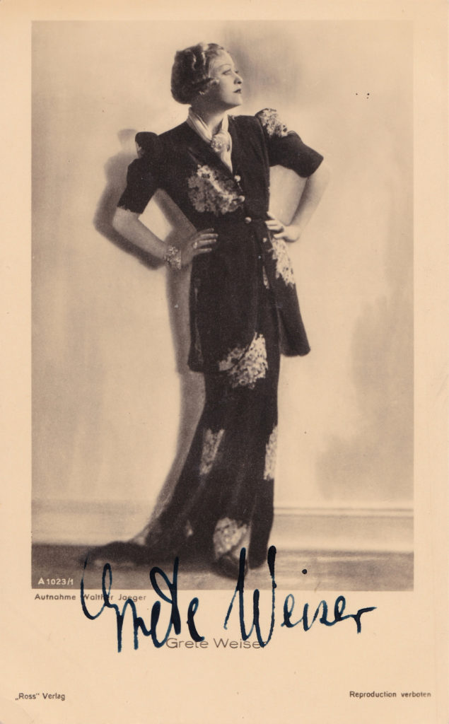 Grethe Weiser stand 1930 erstmals und ab 1932 regelmäßig vor der Kamera. Als Filmschauspielerin war sie in der Nebenrolle „schlagfertige Zofe“ gefragt, beispielsweise in der romantischen Komödie „Eskapade“ (1936). Als Sängerin hatte sie in dieser Zeit erfolgreiche Schlager mit Chansons wie „Der Vamp“ oder „Emil seine Hände“.